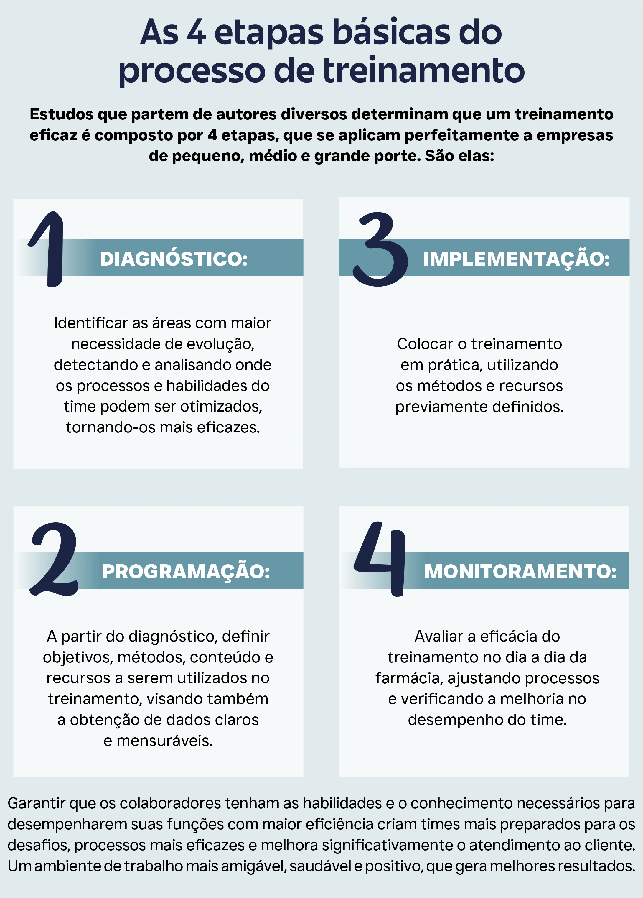 De acordo com a legislação vigente, a RDC 44/2009 determina que todos os funcionários de farmácias e drogarias devem ser capacitados quanto ao cumprimento das Boas Práticas Farmacêuticas, Legislação Sanitária e Procedimentos Operacionais Padrão. Do mesmo modo, a RDC 357/2001 CFF atribui aos farmacêuticos responsáveis a obrigação de treinar seus auxiliares, detalhando suas atribuições e estabelecendo diretrizes que visam qualidade nos serviços e segurança aos pacientes.