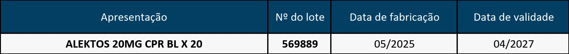 Motivo: Em atendimento à Política de Qualidade, a empresa HYPERA S/A resolve recolher voluntariamente o produto ALEKTOS 20MG CPR BL X 20 Lote 569889.