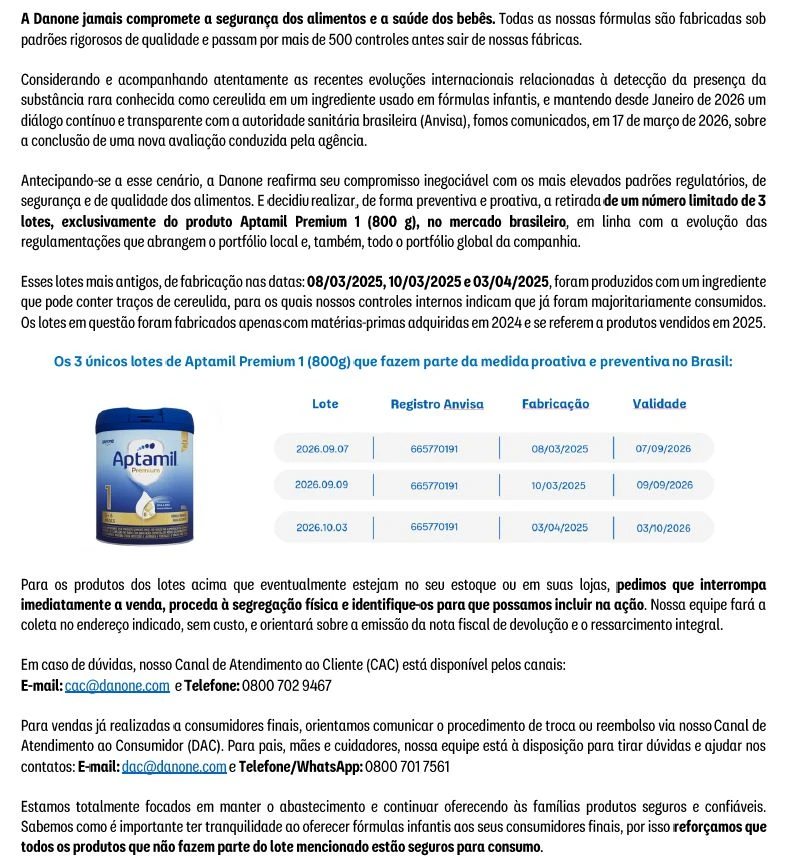 DANONE - Aptamil Premium 1 (800g) | Recall Voluntário e Preventivo
