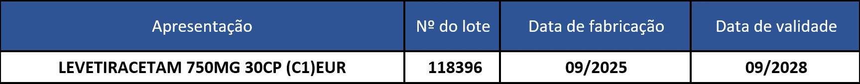A empresa Panpharma Distribuidora de Medicamentos Ltda vem, por meio deste, comunicar que por determinação do fornecedor EUROFARMA, efetuará o recolhimento voluntário do produto LEVETIRACETAM 750MG 30CP (C1)EUR - Lote:
