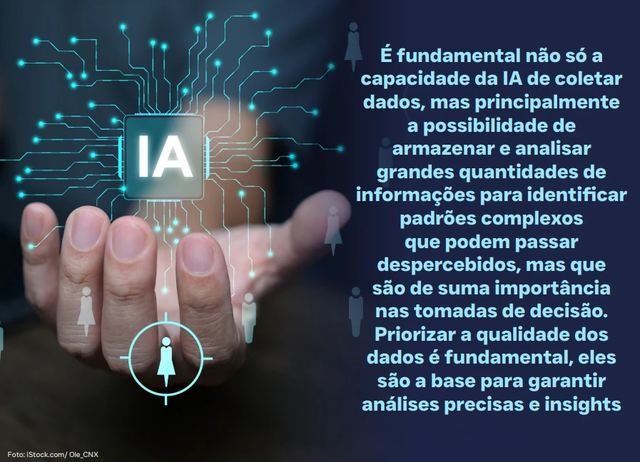 Nesse cenário, é fundamental não só a capacidade da IA de coletar dados, mas principalmente a possibilidade de armazenar e analisar grandes quantidades de informações para identificar padrões complexos que podem passar despercebidos, mas que são de suma importância nas tomadas de decisão. Priorizar a qualidade dos dados é fundamental, eles são a base para garantir análises precisas e insights.