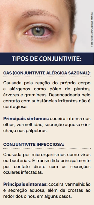 A Conjuntivite Infecciosa, causada por microrganismos como vírus ou bactérias, também tem relação com a sazonalidade devido ao calor e a umidade, que favorecem a disseminação do vírus ocasionando surtos, principalmente no Verão. É transmitida principalmente por contato direto com as secreções oculares, quando a pessoa toca nos próprios olhos infectados e a seguir toca outra pessoa ou alguma superfície, ou pelo uso de objetos contaminados, compartilhando utensílios, toalhas ou maquiagem, por exemplo. Os principais sintomas são coceira, vermelhidão e secreção aquosa, além de crostas ao redor dos olhos, em alguns casos.