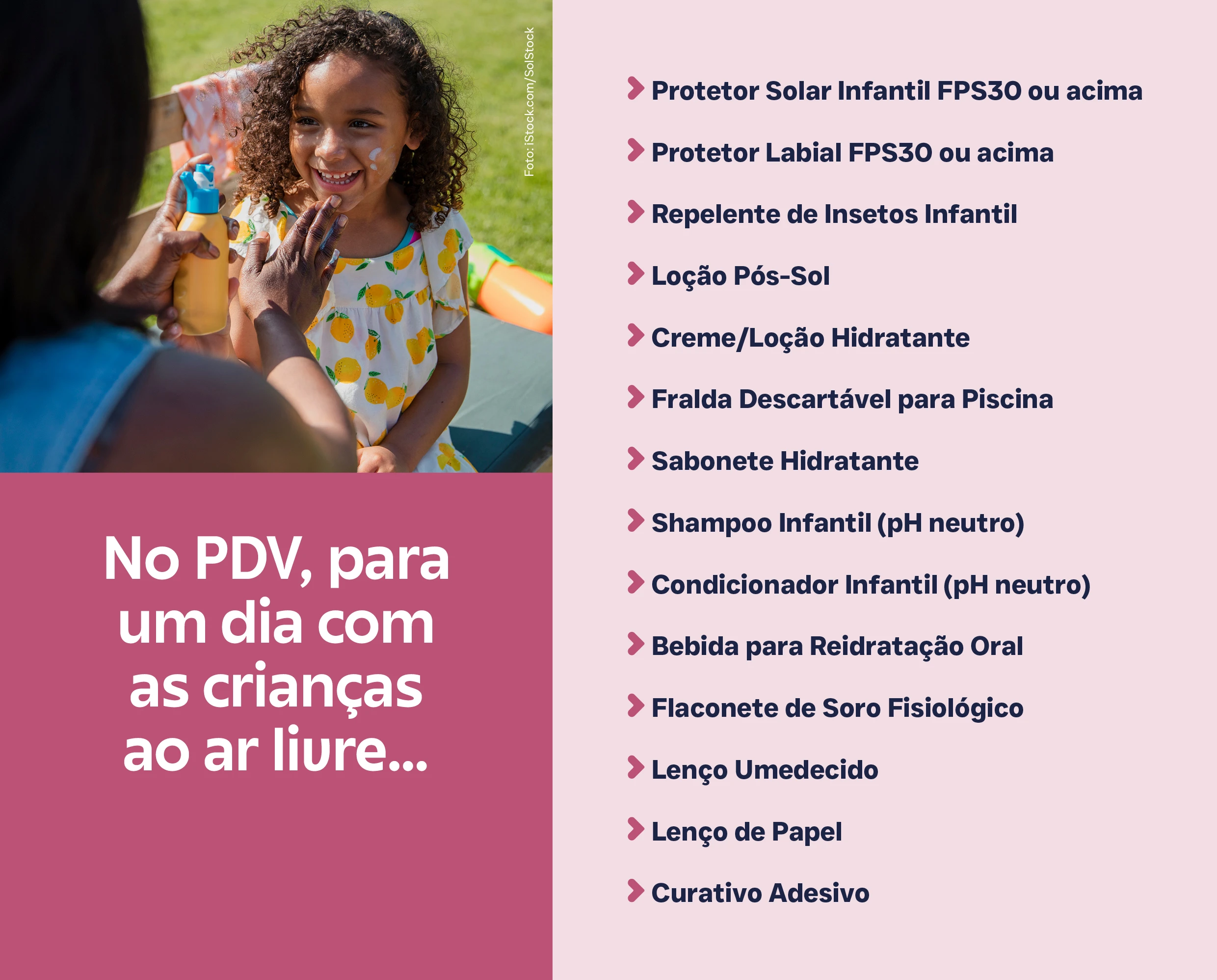 Considerando a importância da proteção e as necessidades específicas da pele infantil, produtos com características especiais são desenvolvidos para garantir maior eficácia e conforto. Na farmácia, um PDV que ofereça um mix estratégico que disponibilize uma variedade de produtos que atenda as necessidades do consumidor e facilite a tomada de decisão é fundamental o ano todo, protegendo nas quatro estações.